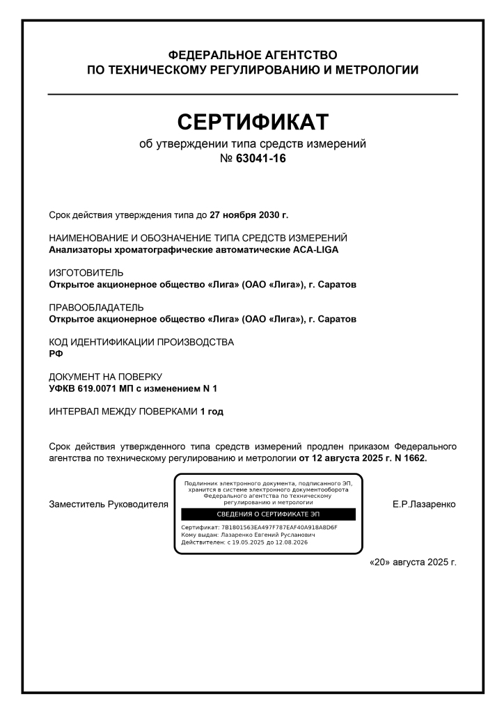 11 марта 2022 года Приказом Федерального агентства по техническому регулированию и метрологии (Росстандарт) №620 внесены изменения в сведения об утверждённом типе анализаторов в части конструктивных изменений, влияющих на метрологические характеристики. Регистрационный номер в Федеральном информационном фонде по обеспечению единства измерений - 63041-16
