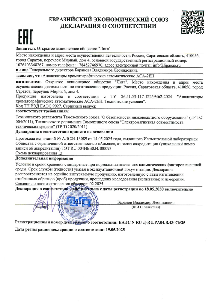 Декларация о соответствии анализаторов ACA-2EH требованиям Технического регламента таможенного союза ТР ТС 004/2011 «О безопасности низковольтного оборудования», Технического регламента таможенного союза ТР ТС 020/2011 «Электромагнитная совместимость технических средств»